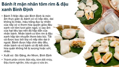 Bánh Ít Mặn đặc sản Bình Định là món ẩm thực giản dị nhưng đặc sắc bậc nhất ở Bình Định, bánh có vỏ nếp dẻo, dai không bị nhão, màu trắng đục tự nhiên của nếp có vị thơm hòa quyện giữa đậu xanh với tôm đất tươi giòn ngọt, vị cay ấm của hạt tiêu tạo nên độ hấp dẫn của nhân bánh. Nhân bánh tôm đất tươi ngọt được nêm nếm các loại gia vị, tôm rim đủ độ mặn ngọt để nhân không bị cứng dai, mà giữ được vị ngọt, tươi giòn của tôm, vị nêm vừa đủ không quá mặn, không quá nhạt , đậu xanh hấp tán nhuyễn thơm béo bùi. Tất cả được bọc bởi lớp vỏ nếp dẻo dai ở ngoài. Bánh được hấp chín dẻo đều, nhân bánh và vỏ bánh có độ kết dính, hòa quện không hề bị sượng hoặc uớt, nhão.