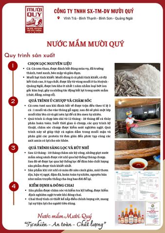 - Thương Hiệu: NƯỚC MẮM MƯỜI QUÝ (Tên tổ chức chịu trách nhiệm sản xuất: CÔNG TY TNHH MTV SẢN XUẤT TM & DV MƯỜI QUÝ)