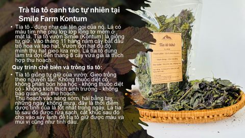Tía tô - đúng như cái tên gọi của nó. Lá có màu tím nhẹ phủ lớp lớp lông tơ mềm ở mặt lá. Tía tô vườn Smile (Kontum) là giống tự giữ. Vào tháng 11 hàng năm cây bắt đầu trổ hoa và tạo hạt. Vườn đợi hạt đủ độ mình thu hạt gieo lứa mới. Lá tía tô dùng làm trà đợi đến tháng 8 cây vừa già là thích hợp thu hoạch.